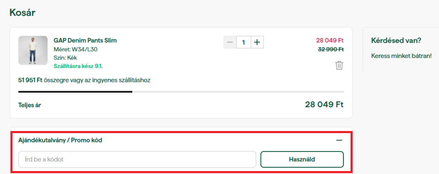 Válassza ki a terméket, amelyet meg szeretne vásárolni, és helyezze a kosárba. A kosárban, a fizetendő összeg alatt található az "Ajándékutalvány/ Promo kód" lehetőség. A mellette található "+" jelre kattintva jelenik meg a mező a kuponoknak. Oda írja be vagy illessze be a megszerzett kódot és kattintson rá a "Használd" gombra és fejezze be a vásárlást. Amennyiben érvényes kódot adott meg, és teljesíti a kupon feltételeit, a kedvezmény automatikusan levonódik a vásárlás összegéből.