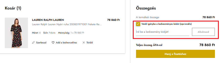 Válassza ki a terméket, amelyet meg szeretne vásárolni, és helyezze a kosárba. A kosárban, az összegzés alatt található a "Vedd igénybe a kedvezményes kódot (opcionális)" lehetőség. Ha rákattint a mellette található üres négyzetre, megjelenik a mező a kuponoknak. Oda írja be vagy illessze be a megszerzett kódot és kattintson rá az "Alkalmazd" gombra és fejezze be a vásárlást. Amennyiben érvényes kódot adott meg, és teljesíti a kupon feltételeit, a kedvezmény automatikusan levonódik a vásárlás összegéből.